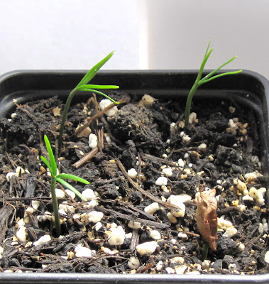 | sprouting seeds Origin: New Caledonia Conservation status: Germination: soaked seeds for  one day in the water, placed them onto wet cotton pads changing the  cotton pads daily. Seeds started sprouting after ca. 6 days. Then  they were placed in the mixture of vermiculite, perlite and potting soil in a heated propagator at about 25°C. Out  of 10 seeds 9 germinated. One seed had double a embryo. Cotyledons appeared after ca. 2 weeks from germination and first needles after almost 2 months. Links: arkive rarepalmseeds  |